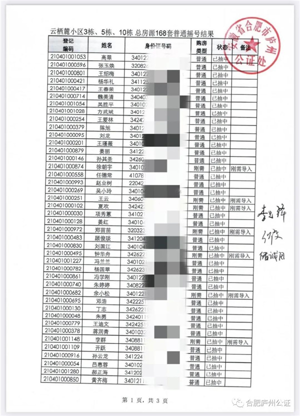 合肥市云栖麓小区3#、5#、10#楼公证摇号结果公示