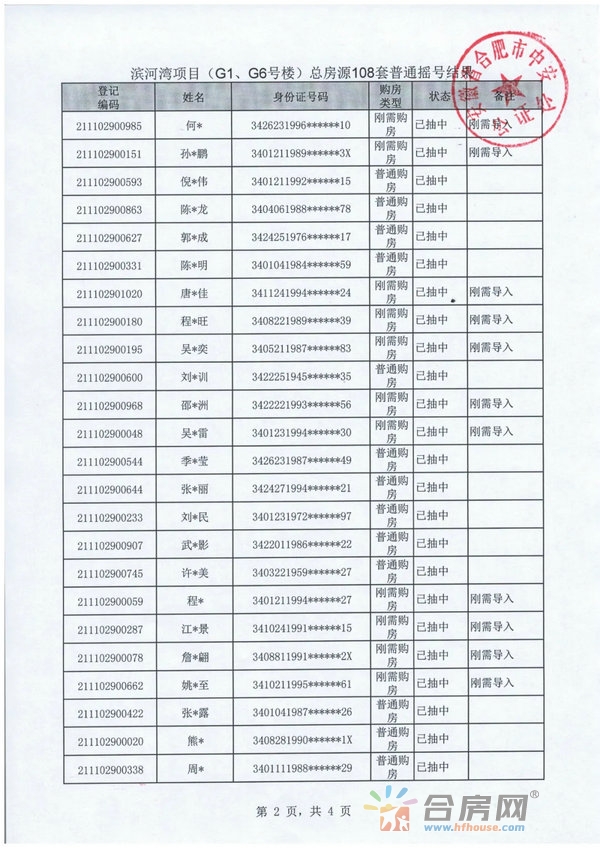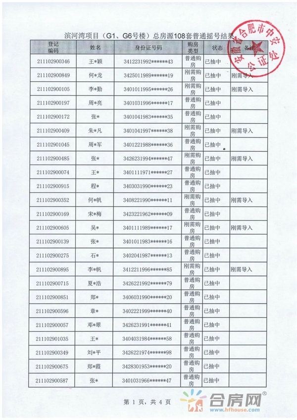 合房网(合肥房地产交易网)讯 合肥滨投文化创意发展有限公司开发的滨河湾项目G1、G6号楼选房资格公证摇号于2021年12月13日在本处举行,现将此次刚需摇号结果、普通摇号结果、递补摇号结果公告如下: